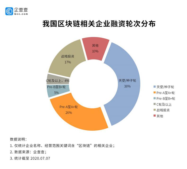 企查查显示,近750家区块链相关企业项目获得资本助力。其中大多数企业处于天使轮到A+轮融资阶段,达所有企业的38%,获得Pre-A轮的企业至A+轮投资的企业占比26%。