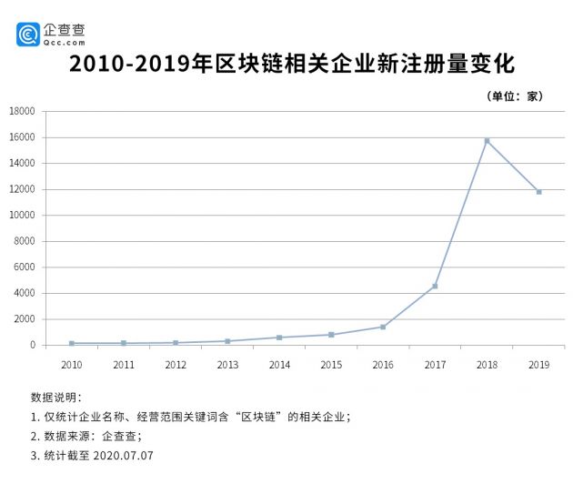 企查查截取了2010-2019年区块链领域相关企业新注册变化数据,可以发现2016年开始区块链行业进入上升通道。而随着比特币价格在2017-2018年间的疯涨,整个区块链行业进入井喷模式,连续两年增长均在200%以上,其中2018年注册量接近1.6万家,同比增长了246%。